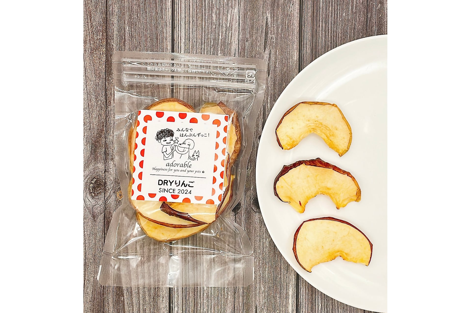 adorableの奥久慈ドライりんごは、栄養価の高いりんごをドライフルーツにした、ヒトとペットちゃんが一緒に楽しめるはんぶんずっこおやつです。